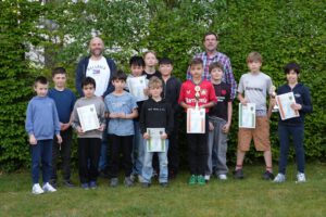 Mit einer Siegerehrung wurde heute die diesjährige Jugendvereinsmeisterschaft der Bergischen Schachfreunde erfolgreich abgeschlossen. Jugendleiter Hans-Josef Weiser fand für alle Teilnehmer, die bis zuletzt unermüdlich gekämpft hatten, anerkennende Worte und überreichte jedem eine Anerkennung in Form eines attraktiven Schlüsselanhängers. In der Gruppe A wurden Paolo Becciu, Johann Künstner, Julian Chen, Magnus Pieper, Alexander Hiersig und Jan Wolf so ausgezeichnet, in der Gruppe B David Schmidt, Arno Lilienfein, Mark Sarkisov, Bing Yang Li, Mateo Juricevic, Felix Moritz, Ole Schümann und Rafael Riegermann. Den jeweils ersten drei einer Gruppe überreichte Hans-Josef außerdem eine Urkunde, die Sieger erhielten zusätzlich einen schönen Pokal. Besondere Erwähnung fand die Turnierleistung von Neuzugang David Schmidt, der in der Gruppe B in acht Partien acht Punkte holte. Paolo Becciu holte den Gesamtsieg in der Gruppe A, hatte diesmal aber einen Punkt an Magnus Pieper abgeben müssen.